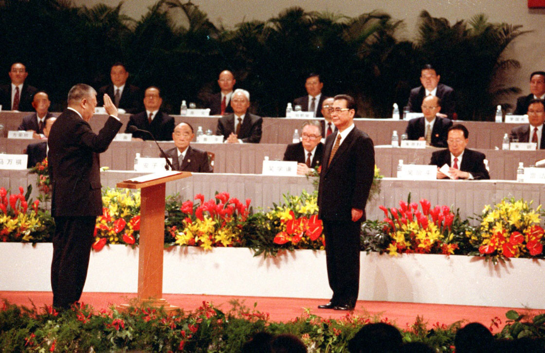 1997年7月1日凌晨,中华人民共和国香港特别行政区成立暨特区政府宣誓就职仪式在香港会议展览中心新翼七楼隆重举行。香港特区首任行政长官董建华宣誓就职,李鹏同志监誓。新华社记者 刘建国 摄