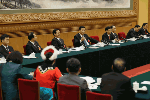 3月7日,中共中央总书记、国家主席、中央军委主席习近平参加十二届全国人大四次会议黑龙江代表团的审议。新华社记者 兰红光 摄