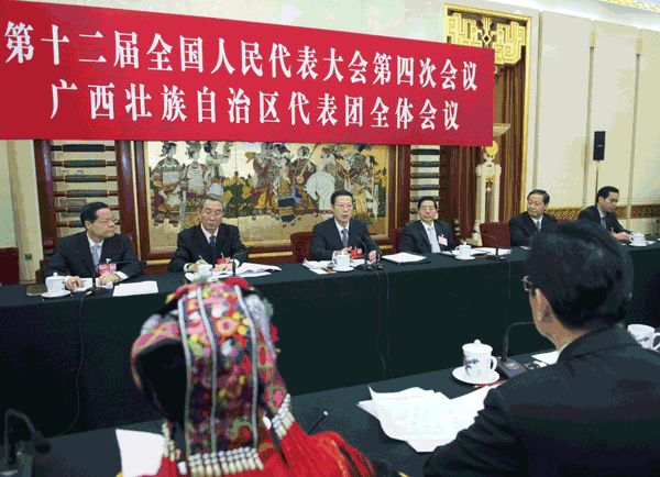 3月7日,中共中央政治局常委、国务院副总理张高丽参加十二届全国人大四次会议广西代表团的审议。新华社记者王晔摄