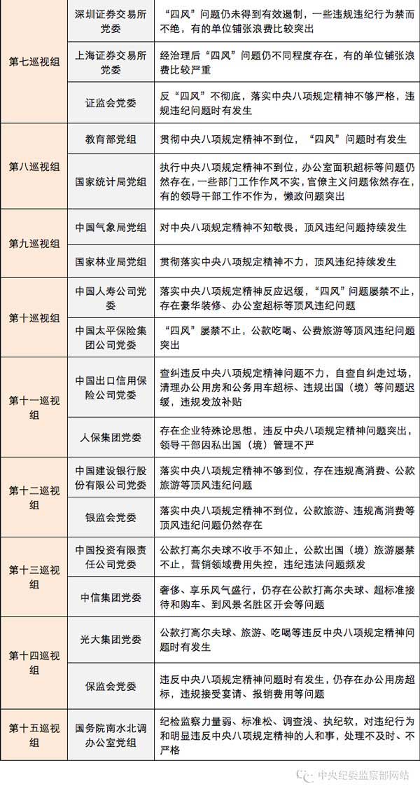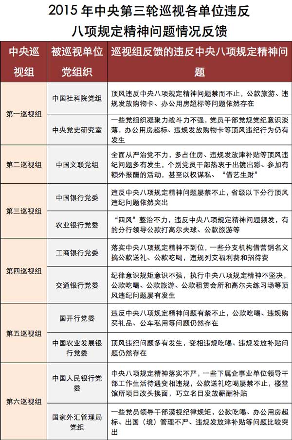 梳理十八大以来中央和各省区市巡视工作,有一个特点颇为明显:同样是违反中央八项规定精神,地区、部门、单位不同,其突出问题和表现形式也略有差异:巡视央企和金融单位,公款吃喝、公费旅游、违规高消费、违规发放津补贴是不少单位的“通病”;巡视省区市,形式主义、官僚主义,领导干部违规多占住房、吃拿卡要、为官不为等问题被曝光较多;各省区市巡视下属地区和单位,公款吃喝,超标准接待,文山会海,收受下属礼金“红包”等,又常常成为干部群众反映强烈的问题……