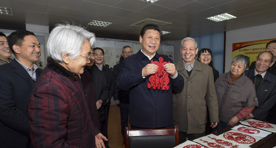 农历羊年春节来临之际,2月13日至16日,中共中央总书记、国家主席、中央军委主席习近平来到陕西,看望慰问广大干部群众,向全国各族人民致以新春祝福,祝伟大祖国繁荣昌盛、各族人民幸福安康。这是15日上午,习近平在西安市雁塔区电子城街道二〇五所社区服务中心,拿起一幅“三阳开泰”剪纸,祝愿全国各族人民新春愉快、羊年大吉,生活喜气洋洋,事业蒸蒸日上。(新华社记者 李学仁 摄)