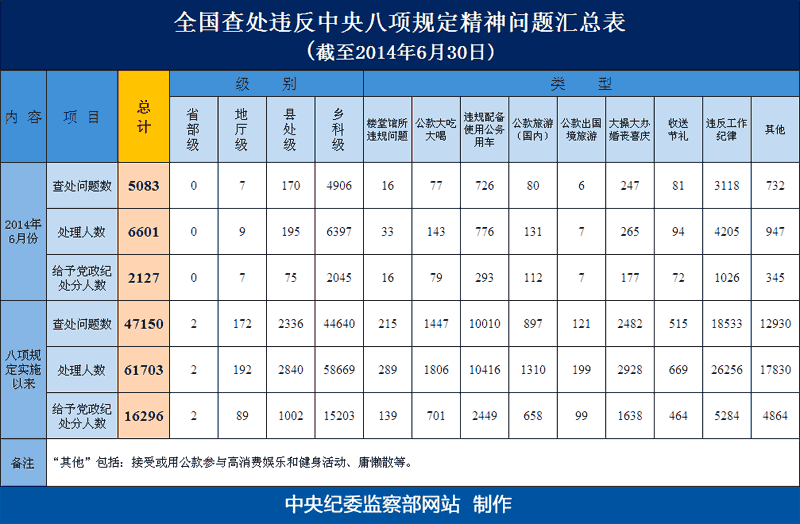 为掌握全国贯彻落实八项规定精神情况,中央纪委在31个省区市和新疆生产建设兵团、59个中央和国家机关建立了落实中央八项规定精神情况月报制度。截至2014年6月30日,全国查处违反中央八项规定精神问题情况如下:
