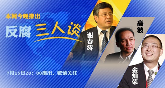 7月15日20:00,中央纪委监察部网站将播出访谈节目《反腐三人谈》,中央党校中共党史教研部主任谢春涛、中国人民大学国际关系学院副院长金灿荣、中国社会科学院中国廉政研究中心副秘书长高波围绕反腐败话题做客在线访谈。敬请关注!