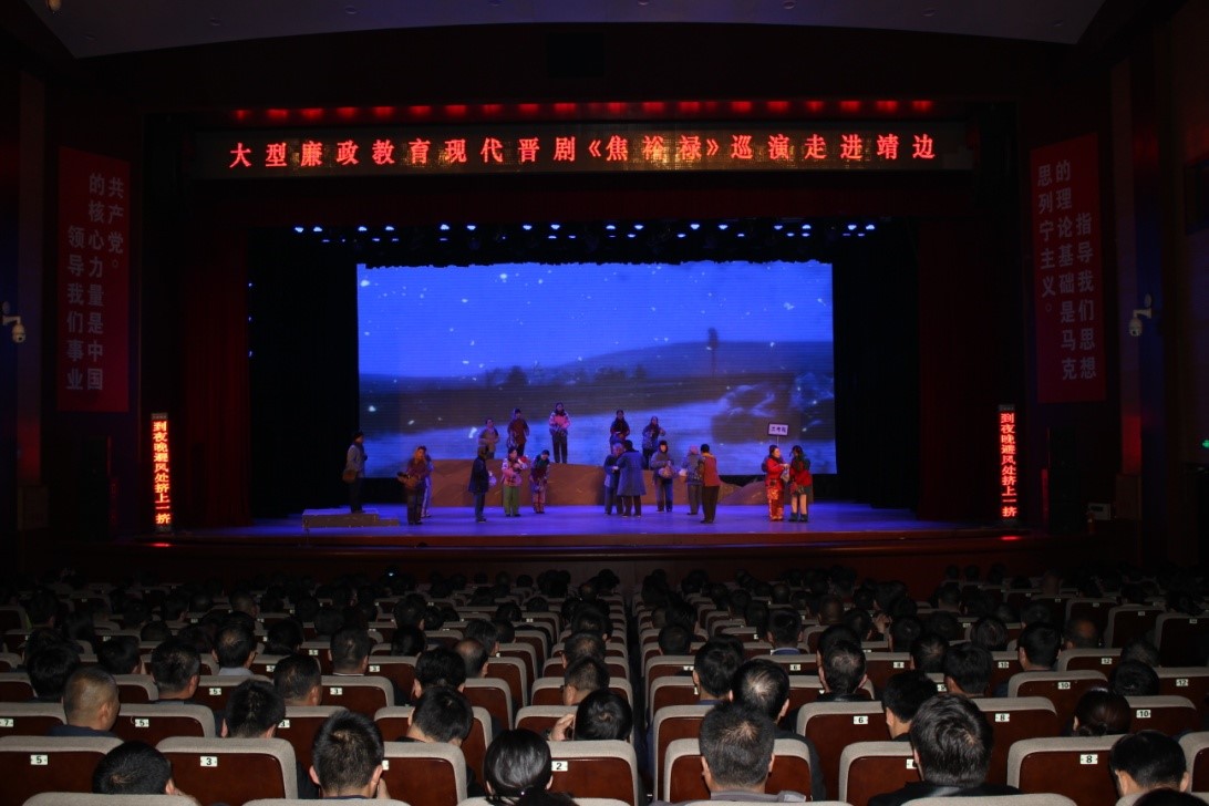 为认真贯彻落实习近平新时代中国特色社会主义思想和党的十九大精神,深入学习贯彻习近平总书记在兰考调研时的讲话精神, 10月30日,由市纪委监委、市文广局主办,靖边纪委监委承办的大型廉政教育现代戏《焦裕禄》巡演在靖边人民礼堂上演,靖边县纪委副书记蒋峰为演出致辞。全体在家的县级领导、各镇(便民服务中心)、张家畔街道、新桥农场、县委和县级国家机关各部门、各人民团体、中省市驻靖各单位班子成员、纪委委员、纪检系统全体干部近800人观看了演出。