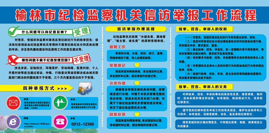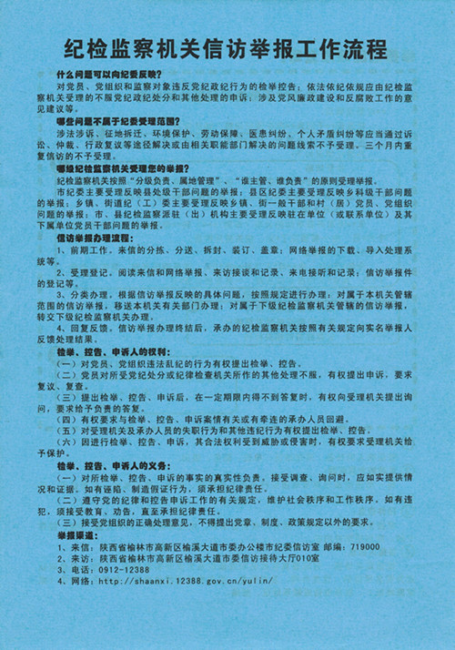 “一图”,即设计制作“榆林市纪检监察机关信访举报工作流程图”。在市纪委信访接待室醒目位置挂放信访举报工作流程图,采取图文并茂的形式,简明清晰的向群众介绍纪检监察机关信访举报的受理范围、信访举报办理流程、举报方式以及检举、控告、申诉人的权利和义务等内容,简洁、直观,群众一看就明白,容易接受。流程图不仅为信访举报部门提供了业务指导,更为引导举报人进行正确、有效的举报提供了指南。