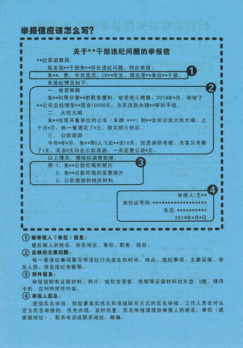 “一卡”,即向群众发放“纪检监察机关信访举报工作流程宣传卡”。宣传卡对纪检监察机关受理信访举报的工作程序等相关内容进行了详细介绍,特别针对群众容易混淆的纪检监察机关受理范围进行了说明,指出哪些问题归纪委管,哪些不属纪委管。为进一步强化属地管理责任,引导群众依法逐级信访举报,宣传卡还详细介绍了市、县、乡各级纪检监察机关的受理对象,指明哪一级纪检监察机关应该受理反映哪些人的信访举报。同时,提供举报信的样板,详细介绍举报信的写法,指导举报人如何写举报信,切实提高群众信访举报质量,便于获取更多有价值的问题线索,充分发挥信访举报“主渠道”作用。