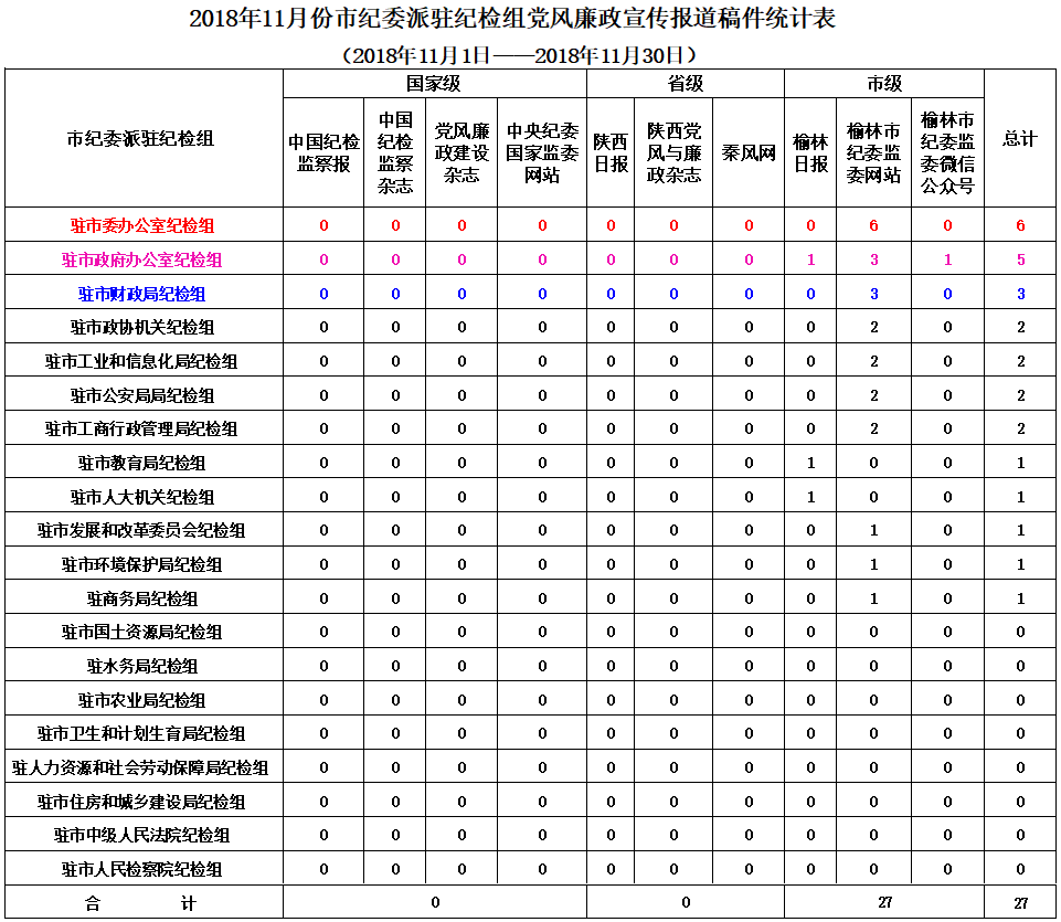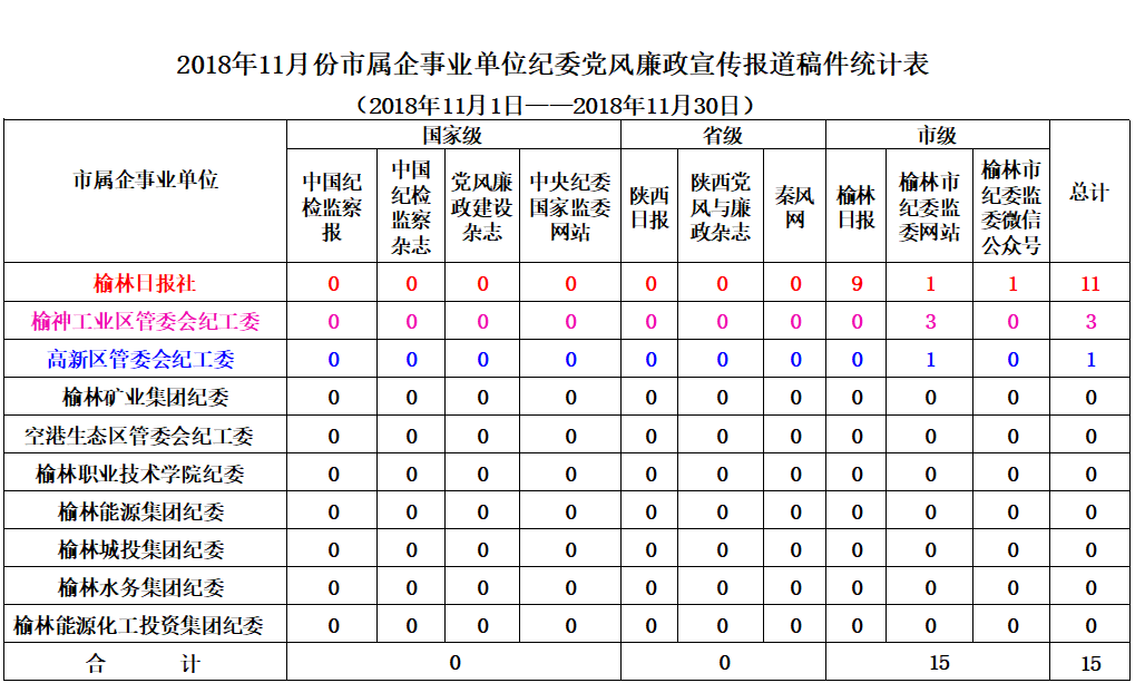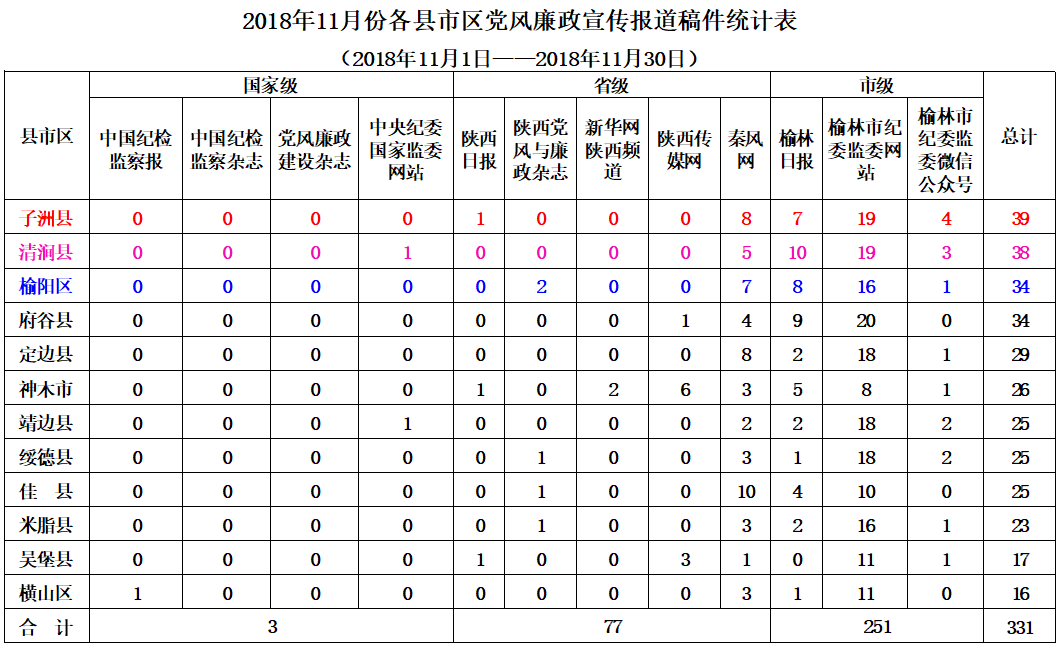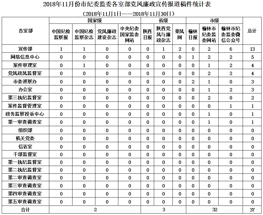 11月份,全市各级纪检监察机关在市级以上新闻媒体共发表稿件410篇,其中:中央级媒体发表5篇,省级媒体发表80篇,市级媒体发表325篇。县市区发表稿件331篇,市属企事业单位纪委发表15篇,市纪委派驻纪检组发表27篇,市纪委监委各室部发表37篇(稿件采用情况附后)。