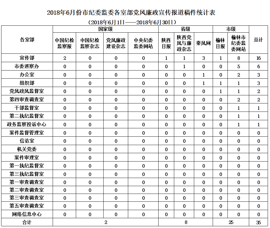 6月份,全市各级纪检监察机关在市级以上新闻媒体共发表稿件186篇,其中:中央级媒体发表4篇,省级媒体发表22篇,市级媒体发表160篇。县市区发表稿件138篇,市属企事业单位纪委发表1篇,市纪委派驻纪检组发表12篇,市纪委监委各室部发表35篇(稿件采用情况附后)。