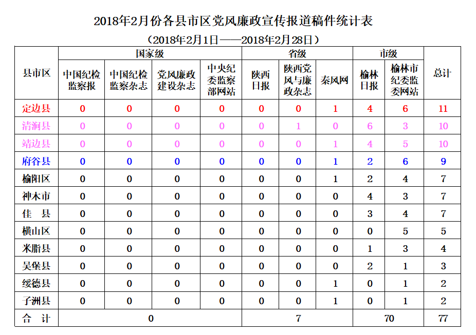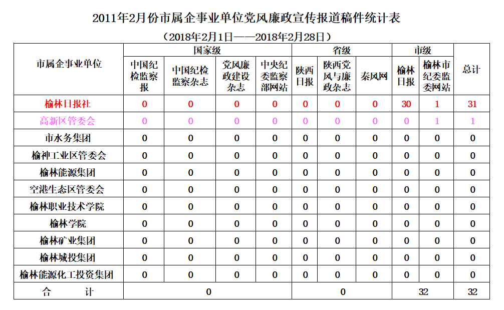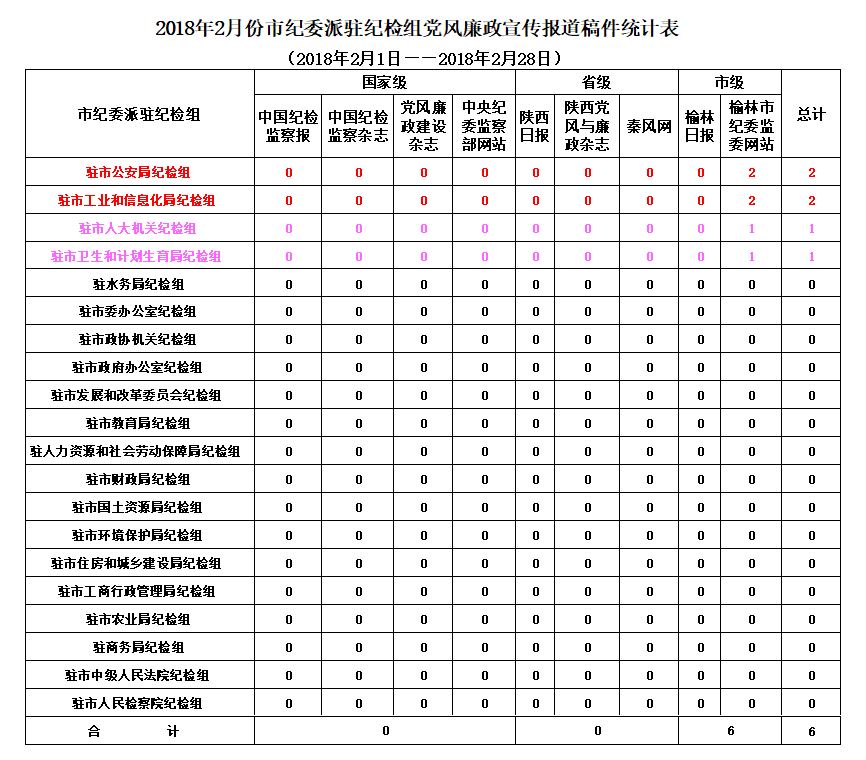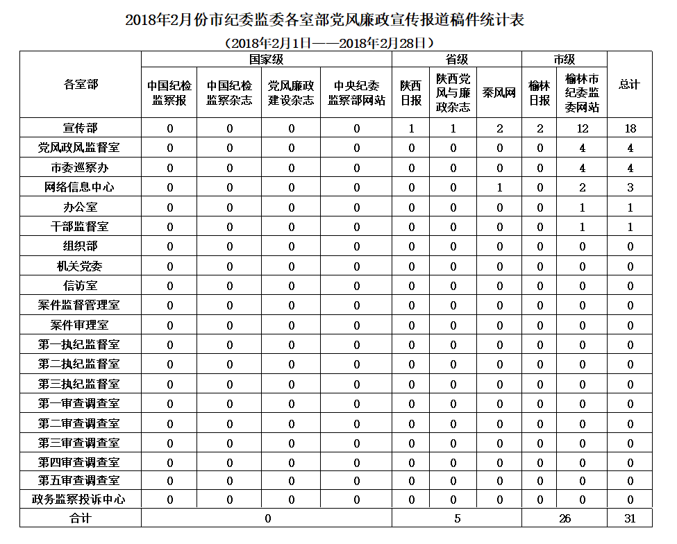 2月份,全市各级纪检监察机关在市级以上新闻媒体共发表稿件146篇,其中:省级媒体发表12篇,市级媒体发表134篇。县区共发表稿件77篇,市属企事业单位发表32篇,市纪委派驻纪检组发表6篇,市纪委监委各室部共发表31篇(稿件采用情况附后)。