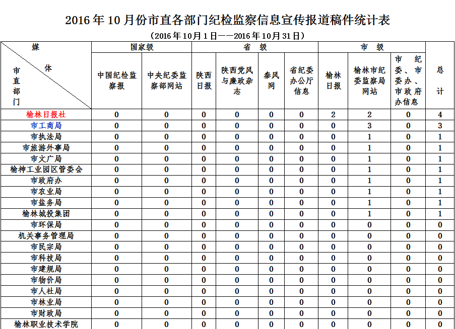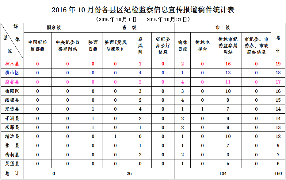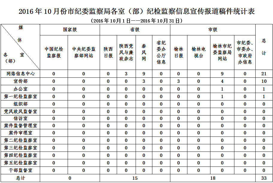 10月份,全市各级纪检监察机关在市级以上新闻媒体共发表稿件208篇,其中:省级媒体发表41篇,市级媒体发表167篇。县区共发表稿件160篇,市直各部门共发表稿件15篇,委局机关各室(部)共发表33篇(稿件采用情况附后)。