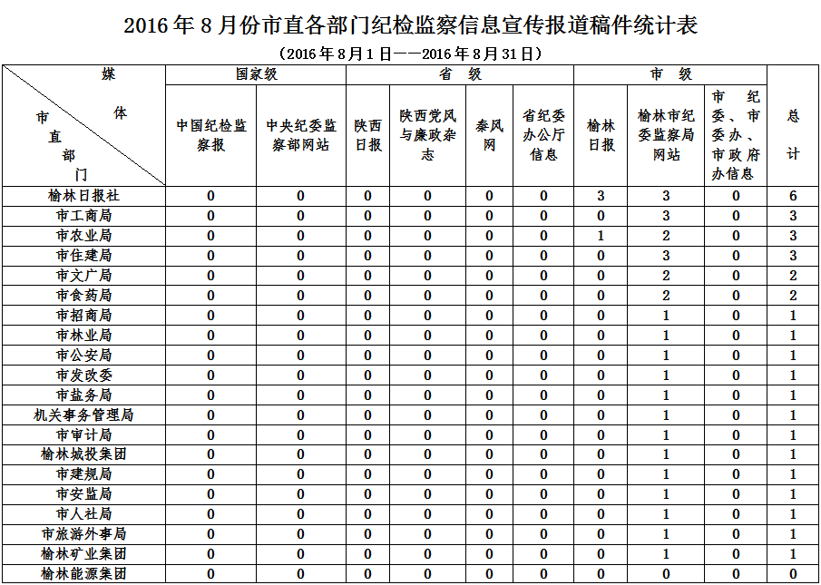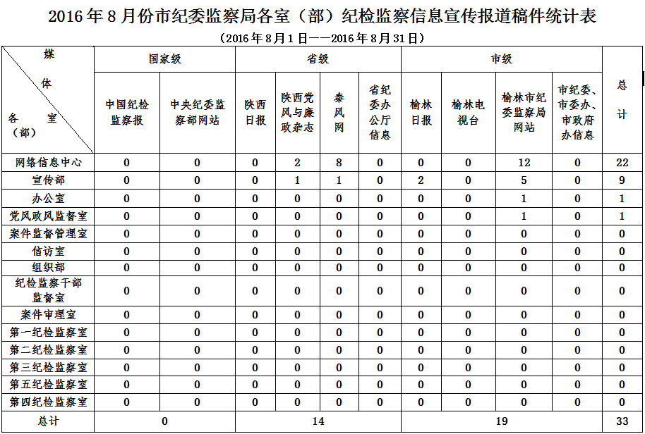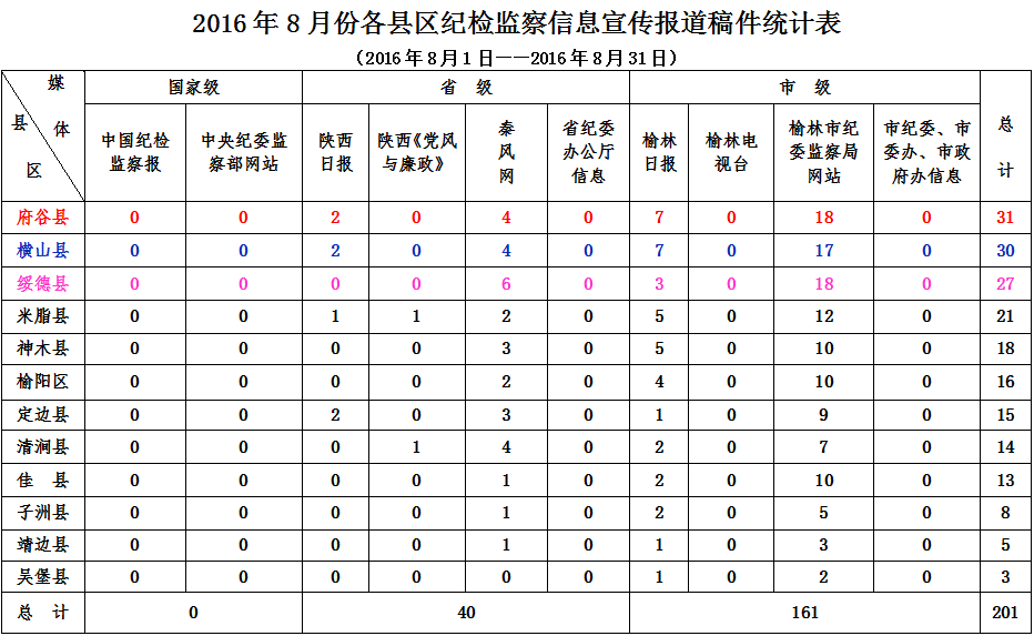 8月份,全市各级纪检监察机关在市级以上新闻媒体共发表稿件266篇,其中:省级媒体发表54篇,市级媒体发表212篇。县区共发表稿件201篇,市直各部门共发表稿件32篇,委局机关各室(部)共发表33篇(稿件采用情况附后)。