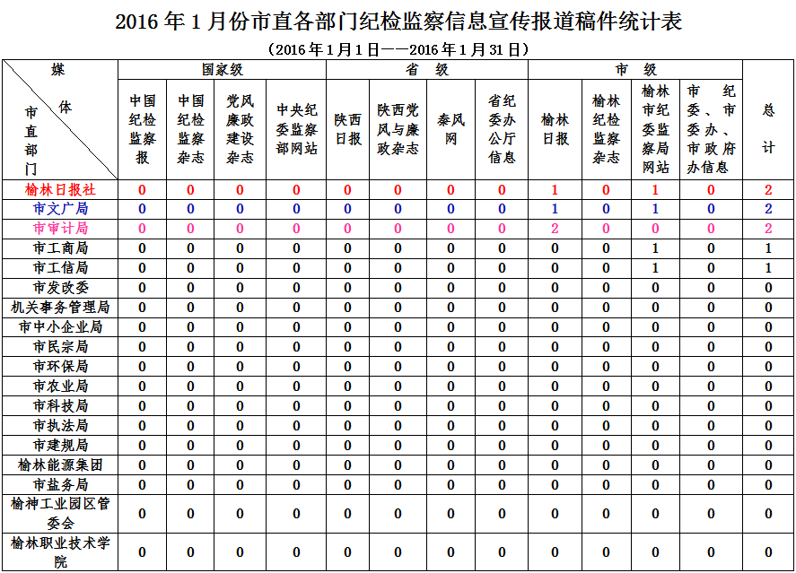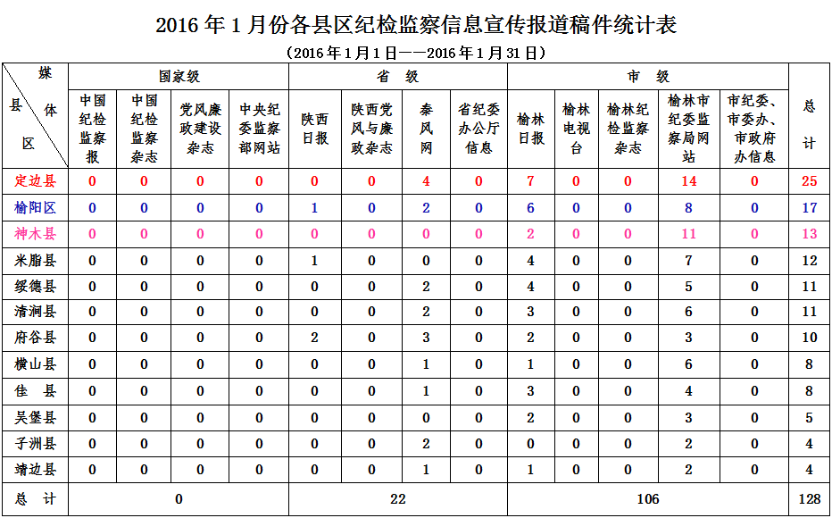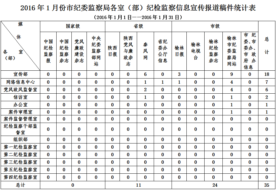 1月份,全市各级纪检监察机关在市级以上新闻媒体共发表稿件171篇,其中:省级媒体发表33篇,市级媒体发表138篇。县区共发表稿件128篇,市直各部门共发表稿件8篇,委局机关各室(部)共发表35篇(稿件采用情况附后)。