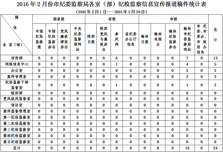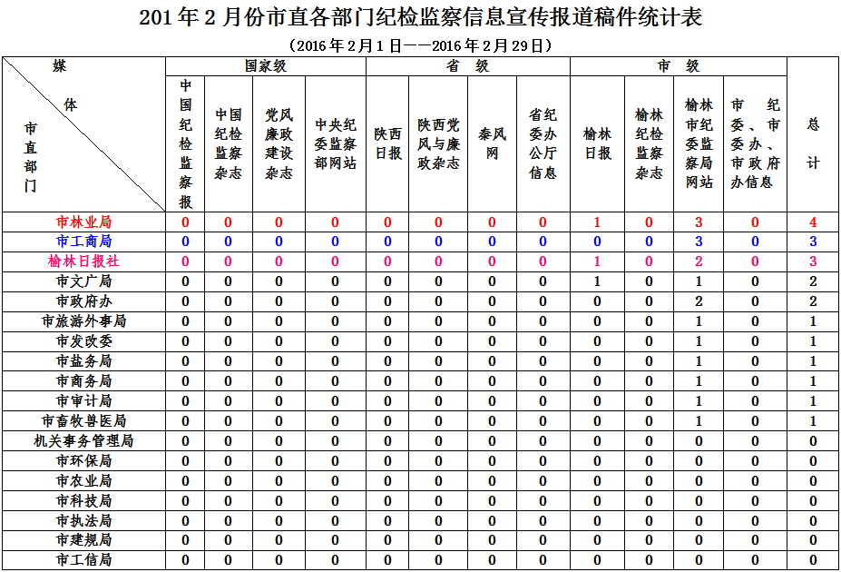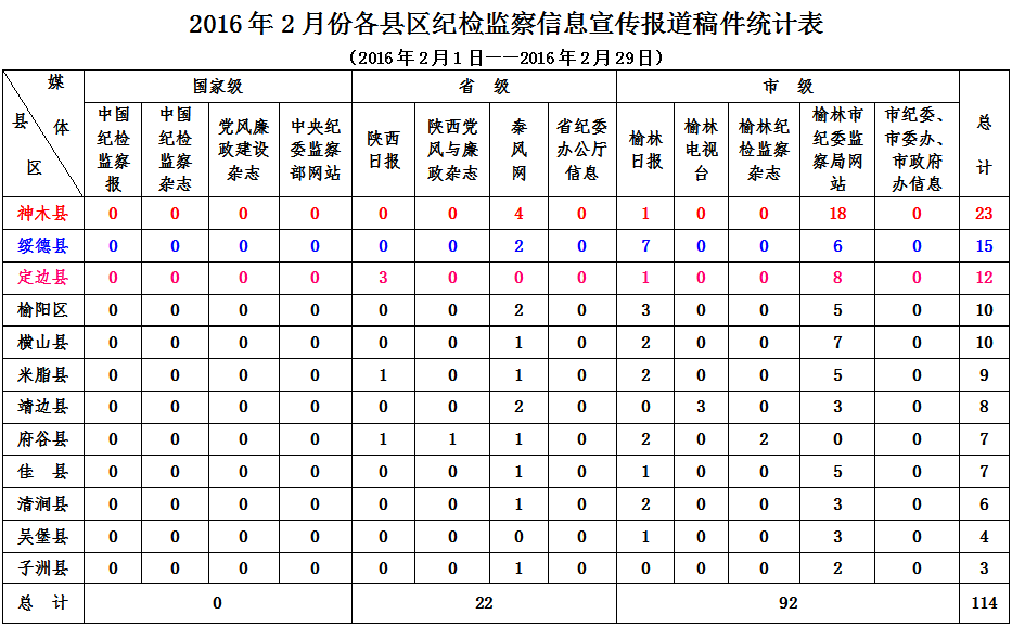 2月份,全市各级纪检监察机关在市级以上新闻媒体共发表稿件158篇,其中:省级媒体发表30篇,市级媒体发表128篇。县区共发表稿件114篇,市直各部门共发表稿件20篇,委局机关各室(部)共发表24篇(稿件采用情况附后)。