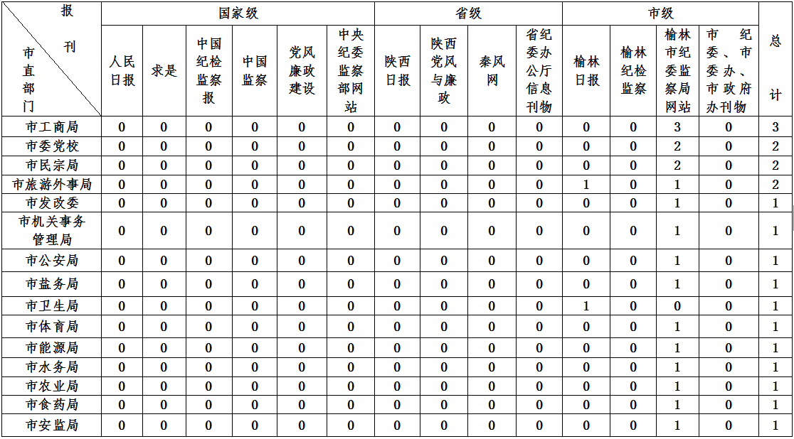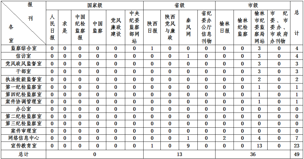 8月份,全市各级纪检监察机关在市级以上新闻媒体共发表稿件271篇,其中:中央级媒体发表1篇,省级媒体发表61篇,市级媒体发表209篇。县区共发表稿件200篇,其中米脂县、清涧县、神木县列前三名。市直各部门共发表稿件22篇(稿件采用情况附后)。